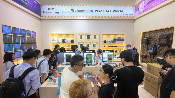 展会现场的互动热潮,正是点音创意社区活力的延伸。展台设置的“像素创作体验区”前,采购商与观众通过手机平板直接参与像素创作,即时生成的作品可同步到展品上展示。这种“即创即用”的模式,正是点音"用户共创"生态的缩影。