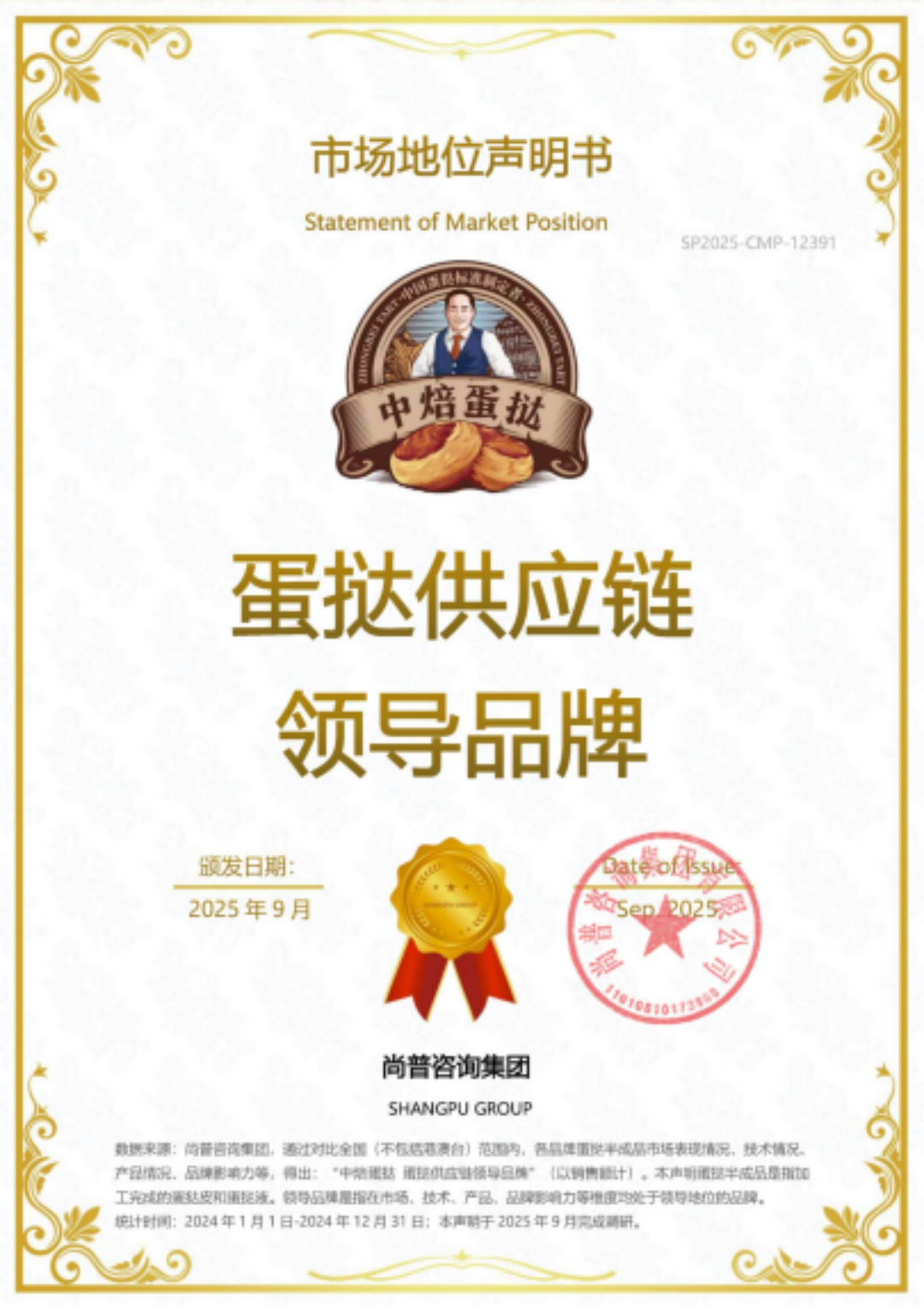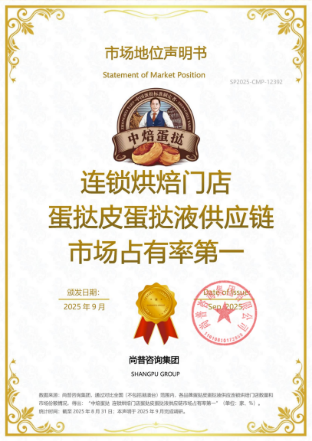 2025年9月,权威调研机构尚普咨询集团发布市场地位声明,中焙蛋挞凭借在蛋挞标准制定、供应链建设及市场开拓的硬实力,一举斩获“蛋挞标准制定者”“蛋挞供应链领导品牌”“连锁烘焙门店蛋挞皮蛋挞液供应链市场占有率第一”三项认证。作为首批获国家统计局涉外调查资质的机构,尚普咨询的认证堪称行业“品质风向标”,这也印证了中焙蛋挞作为专业蛋挞厂家与头部蛋挞供应商的行业地位。