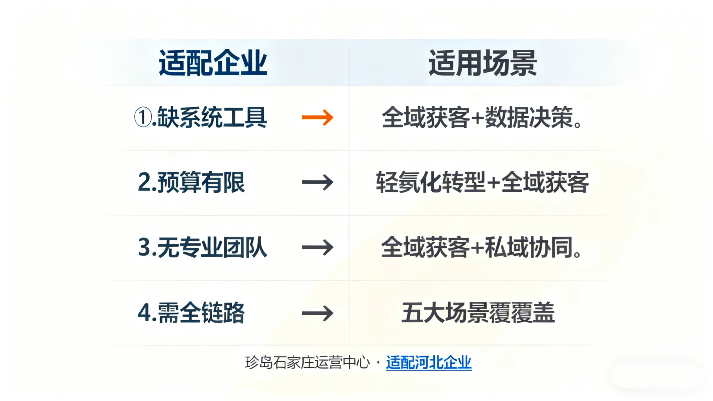 珍岛石家庄运营中心T云国内板块,围绕河北企业 “缺工具、控成本、无团队、需闭环” 的实际诉求,重点服务四类企业: