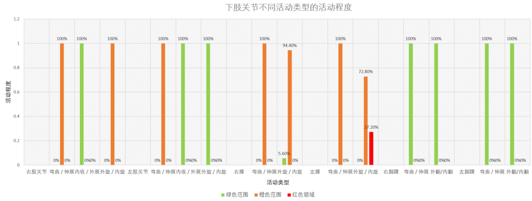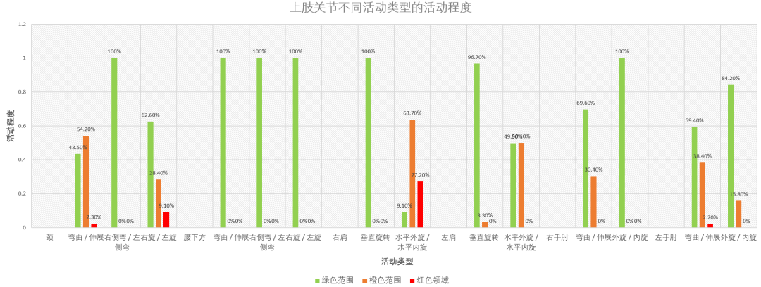 上图为关节活动分布图,图中不同颜色代表固定的活动范围,以肩关节为例,垂直旋转活动中绿色表示0°-60°,橙色表示60°-90°,红色表示大于90°,其中绿色表示正常活动范围,红色代表异常活动范围。