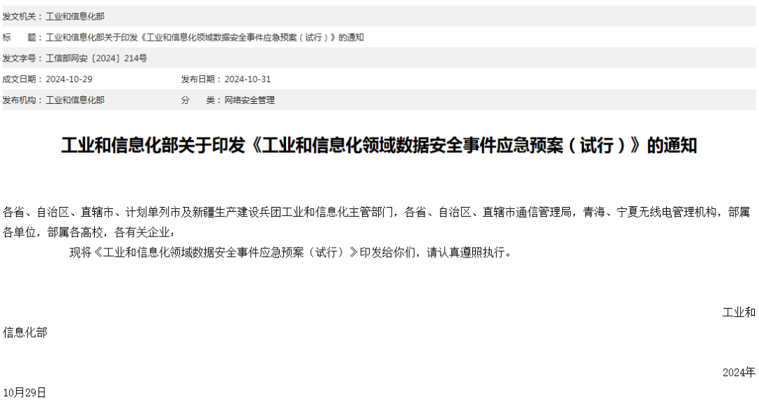 基于此,为执行《数据安全法》、《网络数据安全管理条例》以及《工业和信息化领域数据安全管理办法(试行)》等法律法规中关于应急处理的条款,同时为推动工业和信息化领域数据安全应急处置工作的制度化和规范化,10月31日,工信部发布了《工业和信息化领域数据安全事件应急预案(试行)》(以下简称应急预案)。