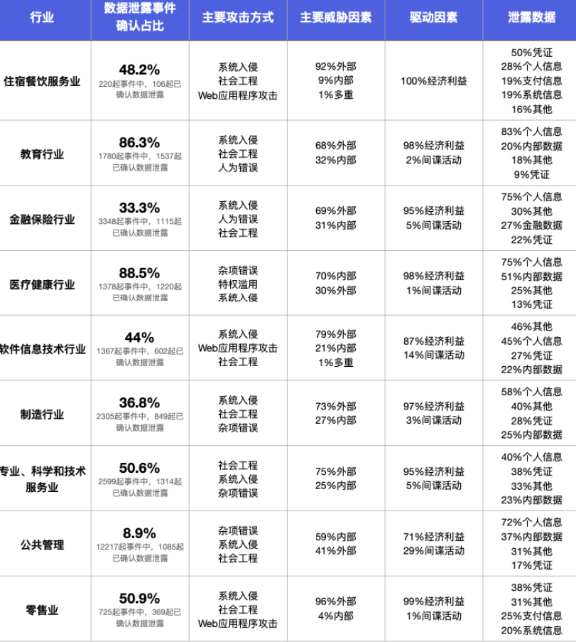 至于目标大多聚焦在哪些行业?据报告显示,医疗健康行业(1220起)仍在众多行业数据泄露事件统计排名中前三,教育(1537起)、专业科学技术服务业(1314起)因高价值数据以及相对滞后的安全保护措施,异军突起,跃升为数据泄露最严重的行业,金融保险业(1115起)、公共管理(1085起)则紧随其后。