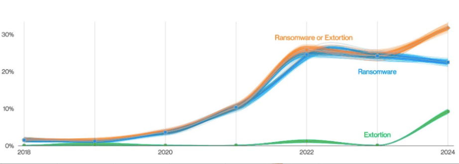 一直到此次最新发布的《2024年数据泄露调查报告》,其显示,涉及勒索软件或其他勒索攻击依然保持增长态势,占所有数据泄露事件的32%,同比去年增幅近8%。同时,每个勒索软件攻击导致的损失成本中位数已从前两年的26000美元增至46000美元。值得注意的是,勒索软件组织新技术的使用导致勒索软件的数量略降至23%,但勒索软件攻击及其他勒索行为,依然成为92%行业共同面临的最大威胁,不容小觑。
