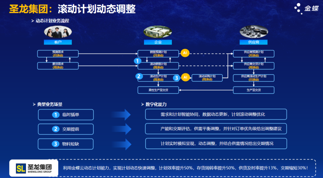 2、圣龙集团动态计划实践:面对主机厂频繁变动的订单需求,圣龙集团构建了三滚动计划体系。通过需求计划、生产计划和采购计划的动态联动,该企业实现了交期的精准回复和供应链的高效协同,有效应对了市场波动带来的挑战。