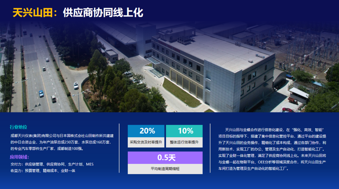 4、天兴山田的供应链协同典范:天兴山田通过建立供应商协同系统,将传统的采购交易升级为网络化协同。该企业实现了询比价、订单协同、条码管理和及时配送的全流程数字化,完美践行了精益管理理念,大幅提升了供应链效率。