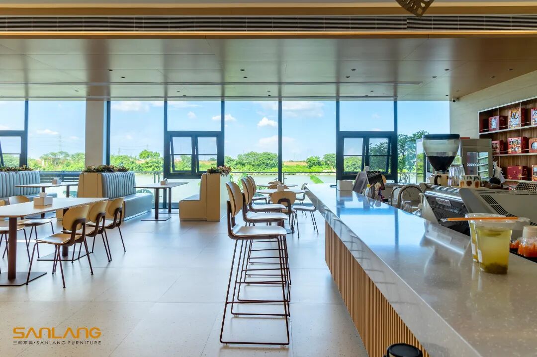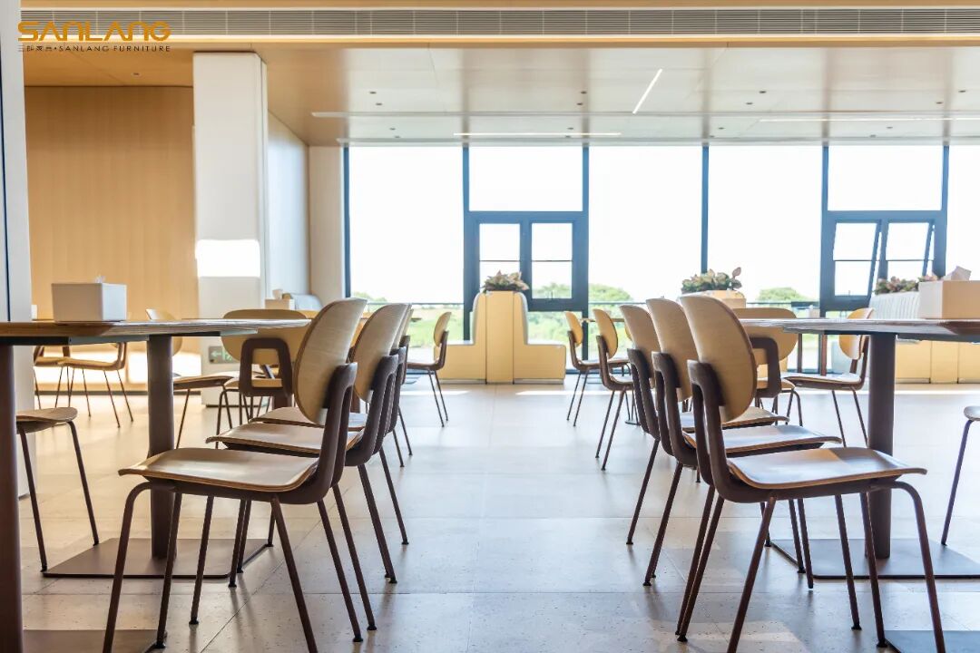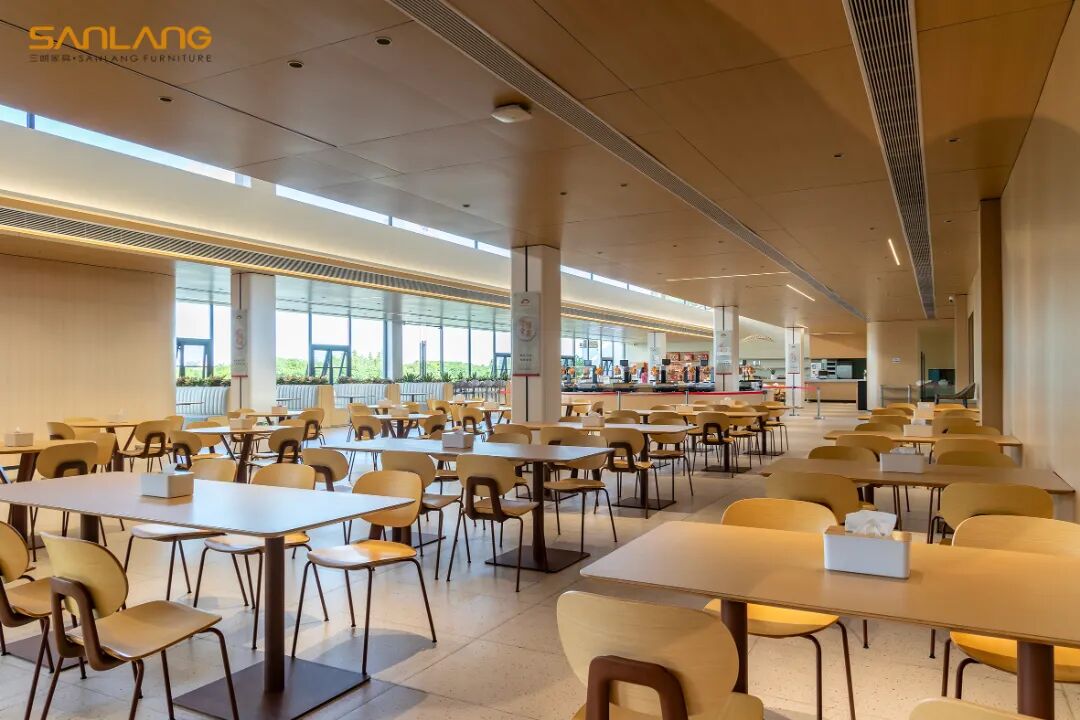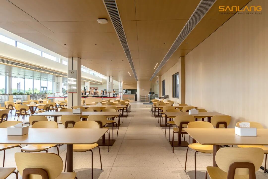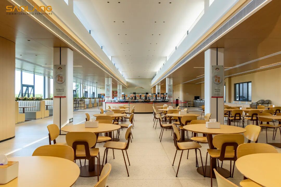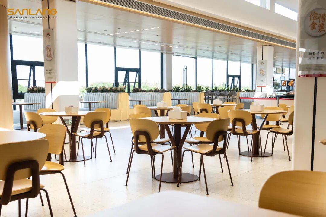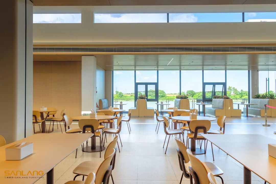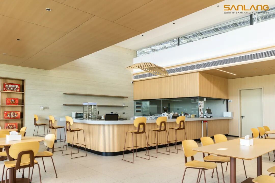 三朗家具以“自然、舒适与功能性融合”为核心,强调现代简约风格,同时注重人性化体验,与亚洲坚果品牌龙头企业共同描绘了一个现代、温馨的餐饮或休闲空间,为其员工提供了一个综合性的食堂餐厅区域。