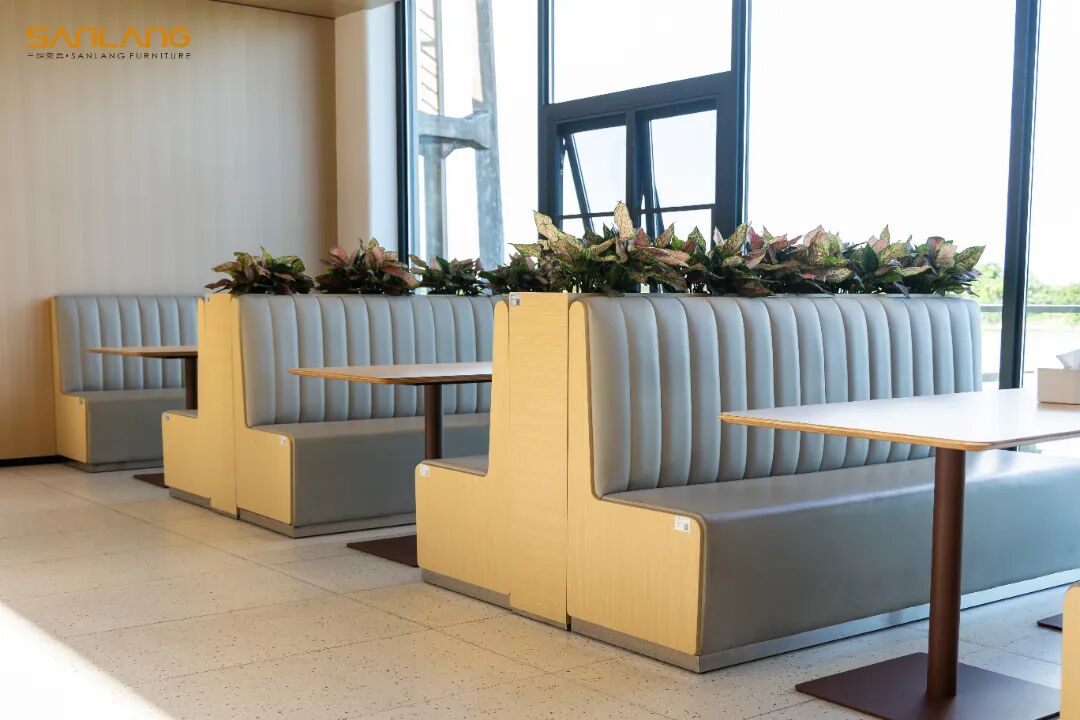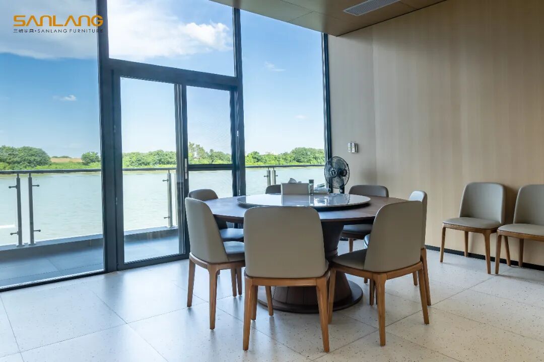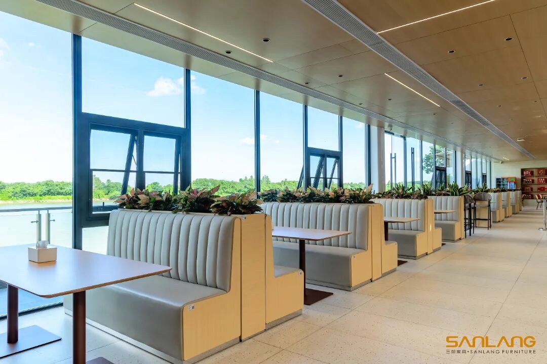 将自然景观变为“下饭菜”:大面积的落地窗将波光粼粼的水面和葱郁树林直接引入空间,让用餐体验从味觉延伸到视觉和心灵层面。霍姆德卡座的半封闭区域为员工提供相对私密的空间,适合朋友聊天或短暂休憩,绿植和温馨氛围鼓励员工放松,提升空间利用率。小型高端的包厢提供一个私密、舒适且拥有绝佳自然景观的专属环境,搭配三朗家具的八角椅,坐感柔软舒适,给员工用餐时带来了更好更舒适的用餐体验。