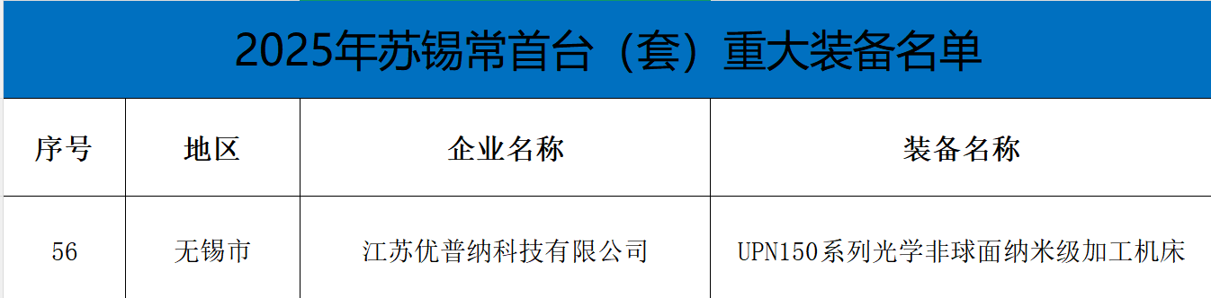 近日,江苏省苏锡常区域2025年度首台(套)重大装备名单正式公布,江苏优普纳科技有限公司自主研发的光学非球面纳米级复合加工机床成功入选。作为光学超精密加工领域的重要装备,这一成果标志着国内在高端非球面光学模具加工设备领域再度实现突破,也意味着国产高端装备在关键技术环节上的自主化程度迈上新台阶。