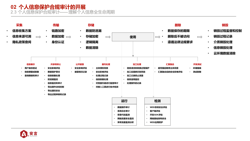 3) 个人信息安全技术:加密措施、去标识化、权限控制、日志记录、身份鉴别、异常检测、安全审计。
