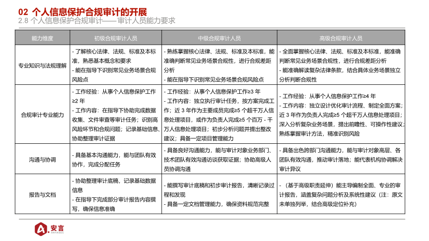 能力要求:按照人员能力和经验不同,个人信息保护合规审计人员可分为高级、 中级、 初级三个级别。个人信息处理者自行开展合规审计的,其审计人员也应具备个人信息保护合规审计人员能力,满足以下要求。