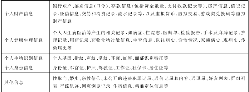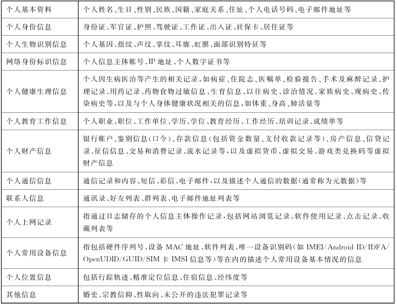 通讯联系方式、通信记录和内容、账号密码、财产信息、征信信息、行踪轨迹、住宿信息、健康生理信息、交易信息等。判定某项信息是否属于个人信息,应考虑以下两条路径:一是识别,即从信息到个人,由信息本身的特殊性识别出特定自然人,个人信息应有助于识别出特定个人。二是关联,即从个人到信息,如已知特定自然人,由该特定自然人在其活动中产生的信息(如个人位置信息、个人通话记录、个人浏览记录等)即为个人信息。符合上述两种情形之一的信息,均应判定为个人信息。